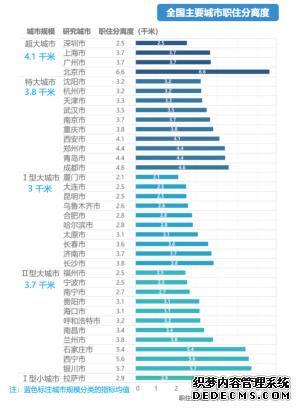 (全国主要城市通勤空间半径) 北京职住分离度最高,居民平均外出6.6公里才能找到一份工作 若想要高效利用城市空间,居住地与就业地之间的合理配置必不可少。《报告》指出,城市中居住地与就业地的最短通勤距离(职住分离度)越小,说明城市职住空间的平衡性越好。目前36个城市的职住分离度处于2.1公里到6.6公里之间,不同城市存在较大差异。 在超大城市中,北京的职住分离度最高,居民需要到离居住地6.6公里外的地方才能找到一份工作;而上海与广州需要3.7公里,深圳只需2.5公里。在以厦门、大连、昆明等为代表的Ⅰ型大城市(城区常住人口300万~500万)中,职住分离度保持在2.1至3.8公里之间,城市职住空间的平衡性较好。而对于Ⅱ型大城市(城区常住人口100万~300万)中的银川、西宁、石家庄等职住分离度大于5公里的城市,则反映出了城市郊区化发展和新区建设的阶段过程。