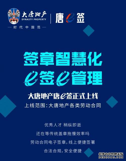 近年来,随着集团业务版图不断扩大,传统印章带来的效率低、风险高等问题日趋凸显,为改善传统印章的弊端,提升集团信息化服务能力,2019年11月,大唐地产集团行政部印章室会同信息部开始筹备电子签章项目。 经过落地方案模拟、技术论证等严格的考核环节,大唐地产最终选定北京数字认证股份有限公司(简称:数字认证)作为供应商,共同搭建“唐E签”电子签章平台。数字认证拥有丰富的地产行业项目成功实践经验,已为包括恒大、万科、融创、龙湖集团、新城控股在内的地产行业Top10的5家企业,提供具备法律效力的全流程闭环交付的电子合同服务。 在数字认证技术支持下,“唐E签”电子签章平台采用人脸识别、电子签名、时间戳等先进技术,可将签署全流程形成固化的证据链,有效保障了签署的合法合规性,确保与纸质签署具备同等法律效力。 电子签章推动流程变革,持续赋能业务 无论是对外经营还是对内管理,集团化地产企业的数字化转型往往“牵一发而动全身”,此次上线“唐E签”电子签章平台,伴随而来的是大唐地产集团管理与业务流程的全方位变革。 以人资合同为例,以往在大唐地产内部,一份异地合同的签署往往需要员工填写资料签字后,邮寄到集团总部统一盖章,再邮寄返还给员工本人,不仅时效低,还面临邮寄途中丢失、损毁的风险。“唐E签”上线后,劳动合同在线上即可完成签署,合同从签署到归档只需几分钟,提升员工入职体验的同时,也大大减少了印章管理人员的工作量。此外,OA内部用印文件、IT类和行政类供应商合同、内外部供应商销售合同等用印场景的电子化,都在不同程度上优化了业务流程,在“提效率、降成本、防风险、易归档”等方面取得了实质性的成效。