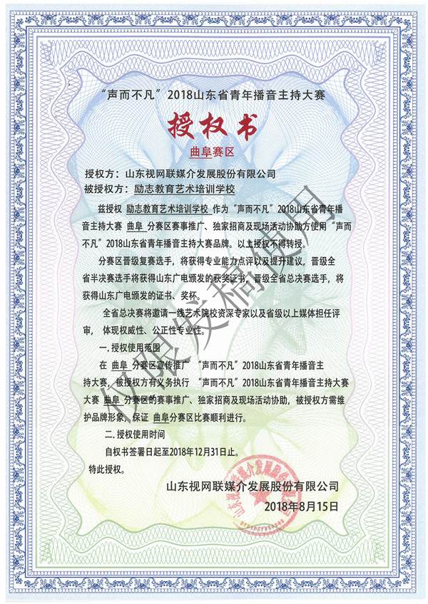 励志教育培训学校承诺,作为曲阜、邹城赛区的赛事运营方,将着力打造“声而不凡”山东省青年播音主持大赛赛区的赛事品牌,发掘优秀传媒艺术人才,保障参赛选手的满意度,维护赛事在业界的认可度与美誉度。 全省其他赛区合作签约 自本月15号起已经全面铺开 赛区合作热线 冯老师 18954509075 0531-81694961