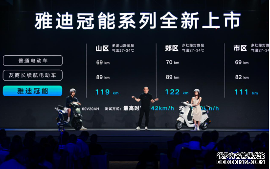 雅迪冠能系列电动车,续航达到122KM 搭载TTFAR 7级增程系统的雅迪冠能系列,由TTFAR电机、TTFAR石墨烯电池、TTFAR能量回收控制器、TTFAR电能监测仪表、TTFAR低滚阻轮胎、TTFAR降电阻电缆和TTFAR低风阻车身七大核心部件组成。 核心技术加持,带来了颠覆性的续航表现。发布会现场,官方公布了雅迪冠能系列电动车的续航成绩。搭载60V20AH规格TTFAR石墨烯电池的雅迪冠能系列电动车,在市区环境下续航达到111KM,在郊区环境下续航更是创下122KM的记录。作为对比,搭载60V20AH规格普通电池的普通电动车,续航仅在69KM~70KM左右。 雅迪冠能系列电动车突破性的续航表现,将大幅改善当下电动车的骑行体验,惠及成千上万的电动车用户。快递、外卖小哥不用再担心骑行续航、动力不足的问题,甚至在不用备用电池的情况下也能完成一天的送货工作;那些距离通勤的白领上班族,通勤工具也将多一份选择。 用户痛点就是创新原点 调研数据显示,无论男女老少,电动车骑行最大的痛点都指向续航,其次是骑行速度和载人动力。用户的痛点就是雅迪必须攻克的难点,在雅迪TTFAR 7级增程系统上,我们看到了电机、电池等核心零部件全方位的创新突破。