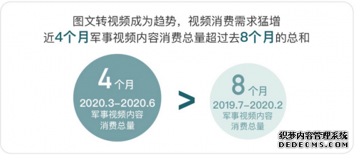 在头条,军事类内容创作多体裁并行,包括图文、短视频、小视频、问答、微头条等,给用户更多消费选择。报告显示,图文类内容消费占比较高,有显著优势。但随着图文转视频成为趋势,视频消费需求猛增,近4个月(2020.3-2020.6)军事视频内容消费总量超过过去8个月(2019.7-2020.2)的视频消费总和。