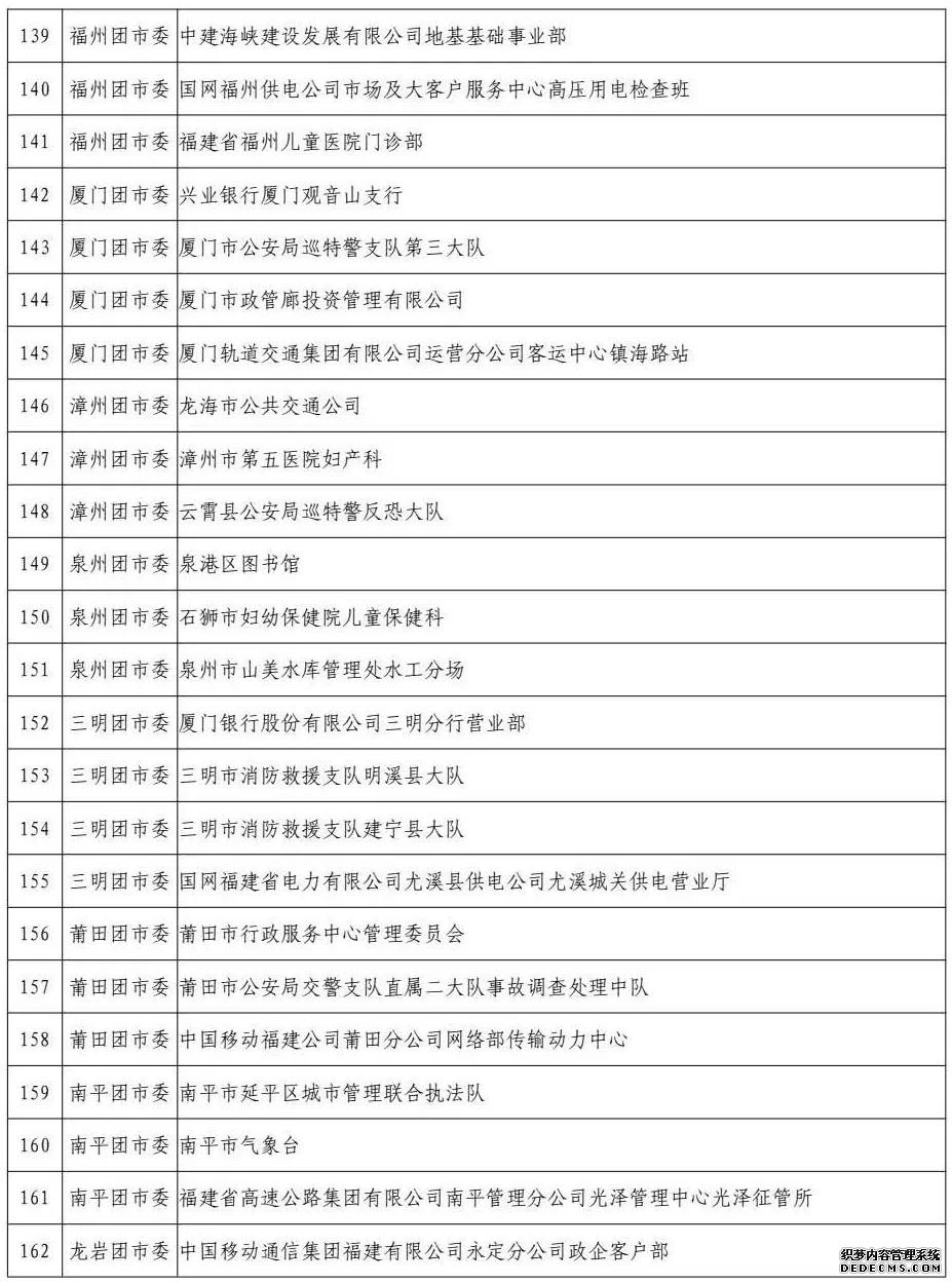 有这样一批青年集体, 他们争创服务一流、管理一流、 人才一流、文化一流、效益一流, 打造行业特色、创新工作亮点、树立服务品牌, 他们就是青年文明号集体。 近年来,我省广大青年响应省委、省政府的号召,积极投身福建改革发展建设,认真开展青年文明号创建活动,并取得了显著的成效。为表彰先进、树立典型,进一步激励广大青年投身青年文明号创建活动,促进经济社会发展,经各行业(系统)、各设区市组委会的逐级推荐,省组委会的统一验收、复核、认定评审,且公示期间无异议,现决定认定参与2019年省级青年文明号创建工作的福建高院诉讼服务中心等172个集体为“2020年—2022年”省级青年文明号。