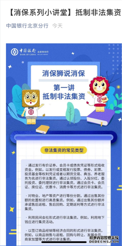 厅堂宣传守阵地,有效引导造声势 活动期间,中行北京分行充分发挥辖内200余家基层营业机构的触角作用,全面铺开厅堂宣传,使网点宣传阵地的作用进一步凸显。 在各家网点的消费者权益保护专区,海报、宣传手册、宣传折页等宣传材料有序摆放,十分醒目,方便客户随时取阅;海报机、液晶电视等电子载体也持续滚动播放相关内容;同时,在客户等候办理业务时,网点大堂工作人员还会为客户发放宣传资料,让客户可以利用空闲时间了解金融知识。 线下宣传“走出去”,有的放矢效果佳 今年以来,中行北京分行将线上宣传作为金融知识普及的主要渠道,但随着国内疫情的不断缓解,进入6月,该行也在稳妥有序的前提下,重新“走出去”,开展了针对特殊群体的线下宣传。 例如,中行辖内宣武支行的消保志愿者去往朝阳区某工地,向外来务工人员普及支付安全与个人信息保护方面的知识;中行总部基地支行走进社区,主要面向中老年群体宣传了电信网络诈骗防范知识;中行丰科路支行在办公楼密集的商圈开展宣教,为外卖送餐员、快递小哥、社区保安等人员讲解金融诈骗案例,并发放了宣传资料。这些贴近生活、实用性强的金融知识经过中行工作人员深入浅出的讲解,很容易被群众消化吸收,提升了宣传效果。