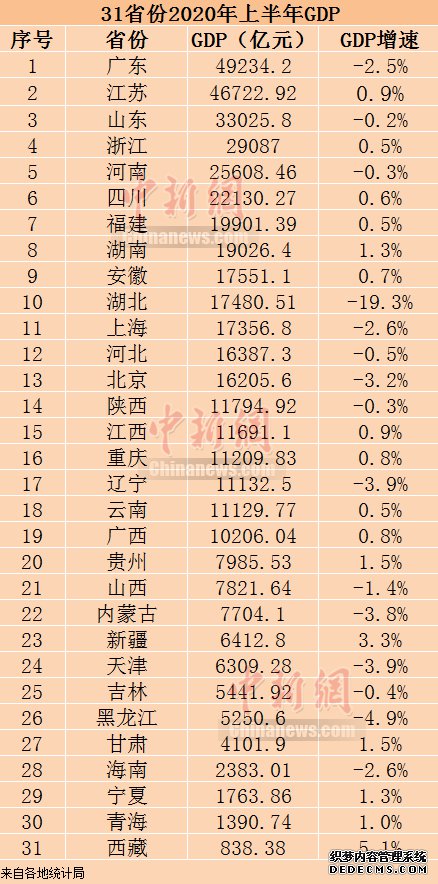 上海外滩。中新网记者 张旭 摄 北京、上海GDP负增长 上海上半年GDP为17356.8亿元,同比下降2.6%,GDP掉落前十,排名第11位。 北京上半年GDP为16205.6亿元,同比下降3.2%,GDP位居第13,被河北反超。 专家分析,京沪等大城市第三产业集聚,经济更依赖于消费,而疫情下的消费复苏不像工业部门那样能够直接得益于各类逆周期政策,缺乏政策抓手,因而速度较慢。 数据显示,上半年北京、上海社会消费品零售总额分别同比下降16.3%、11.2%。 不过,随着疫情防控好转,尤其是北京新发地疫情得到控制,北京经济呈现逐步回升态势,上半年GDP降幅比一季度收窄3.4个百分点。上海上半年GDP降幅比一季度收窄4.1个百分点。 东北三省中吉林恢复最快 上半年,东北三省GDP增速还是负增长,其中吉林恢复最快。 吉林上半年GDP为5441.92亿元,同比下降0.4%,但增速比一季度提高6.2个百分点,高于全国平均水平1.2个百分点。 辽宁上半年GDP为11132.5亿元,同比下降3.9%,降幅较一季度收窄3.8个百分点。 最后一个公布数据的黑龙江,上半年GDP为5250.6亿元,同比下降4.9%。其位次被吉林反超。