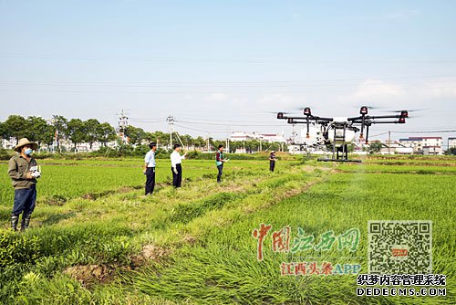 新干县农业服务公司利用植保无人机为托管的农田喷洒农药。通讯员李福孙摄